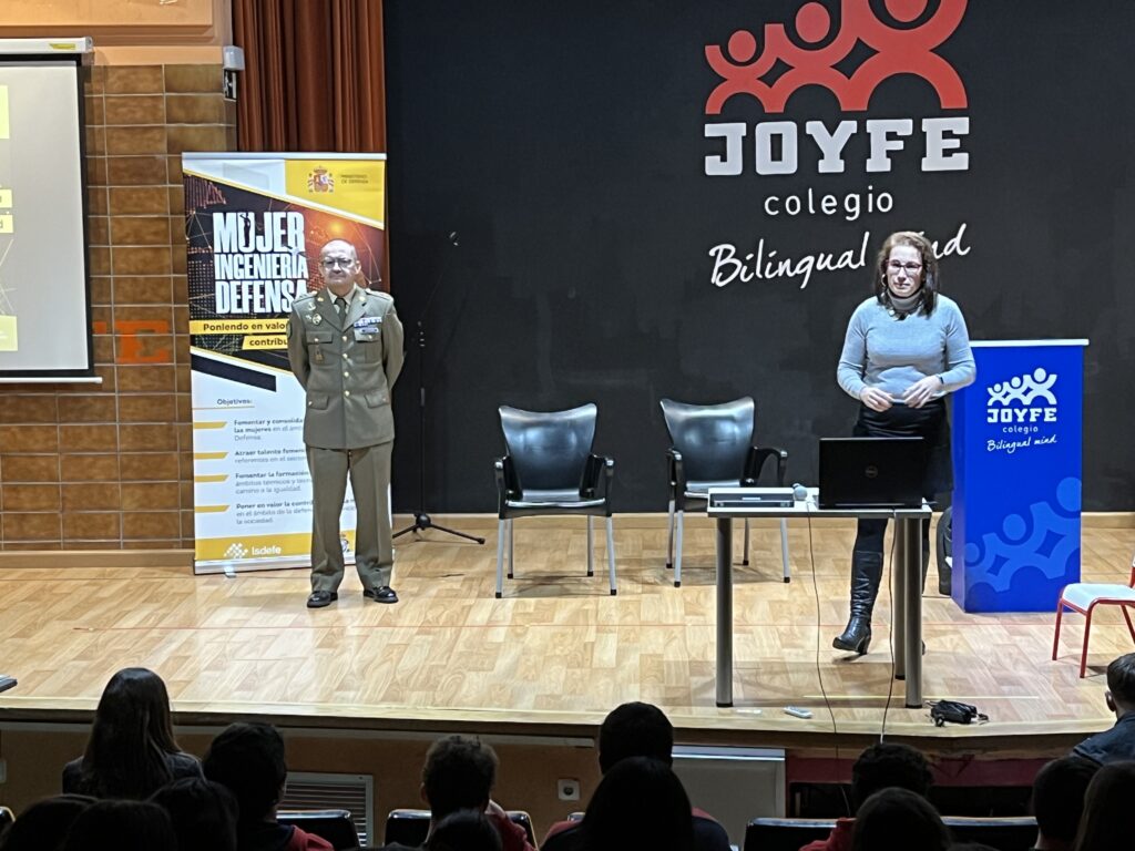 Noventa alumnas y alumnos que cursan 4º de la ESO en el Centro Educativo JOYFE de Madrid asistieron a la charla impartida por el coronel Gabriel Cercenado y la ingeniera de Isdefe Beatriz Carazo.